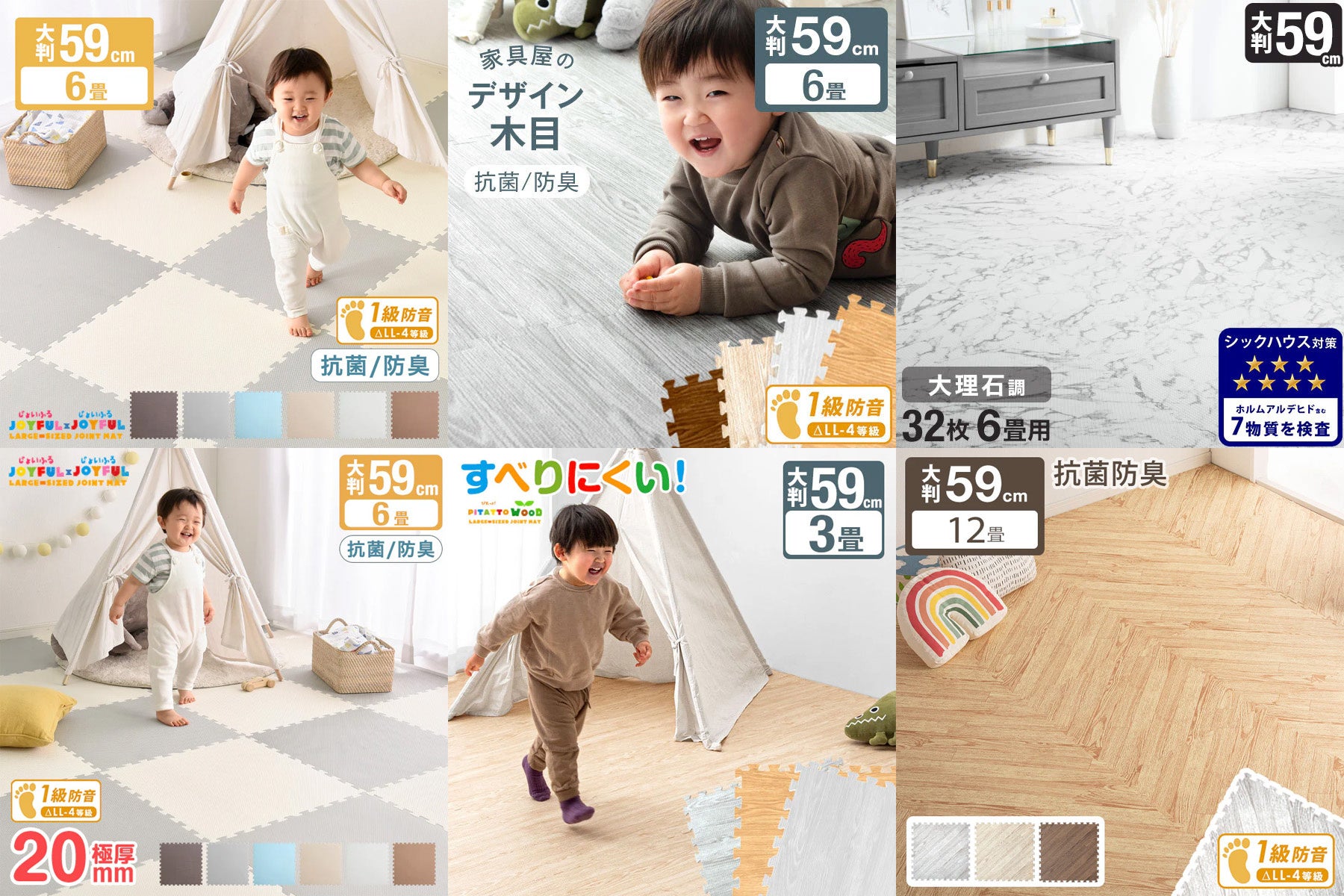 ジョイントマットは、クッション性や防音性が期待できることから、赤ちゃんやお子様、ペットのいるご家庭で高い需要があります。中でもタンスのゲンの「JOYFUL×JOYFUL」シリーズは、シックハウス症候群の原因とされる7種の物質に関する検査をクリアし、抗菌・防臭加工も施されており、より安心・安全にご使用いただける仕様となっております。また、1辺59cmの大判サイズを採用しているため、敷き詰めに必要な枚数が少なく、簡単にお部屋の床に設置することが可能です。