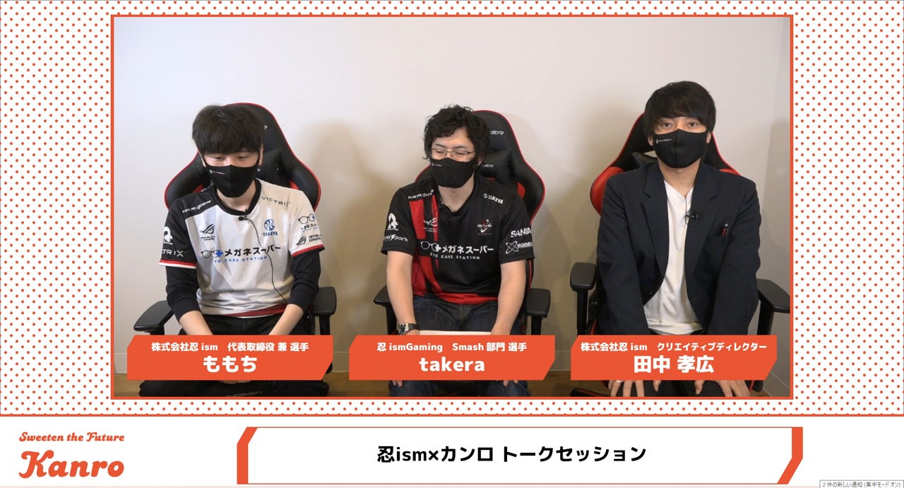 カンロはサステナビリティ活動の一つとして糖の価値創造に取り組んできました。ブドウ糖は脳のエネルギーになることから、脳を酷使するeスポーツプレイヤーをサポートするために忍ismと商品開発を行ってまいりました。忍ismの後進の育成などを含めたeスポーツ業界全体の活性化を目指す考え方に共感し、商品以外でのeスポーツ業界の発展に寄与するために、本年4月にスポンサー契約を締結しました。その取り組みとして、カンロと忍ismが「糖とeスポーツ」をテーマにeスポーツ業界を志す専門学生に向けてオンラインセミナーを初開催いたしました。