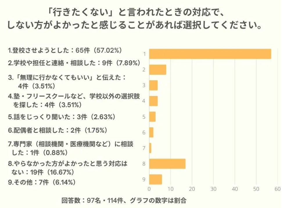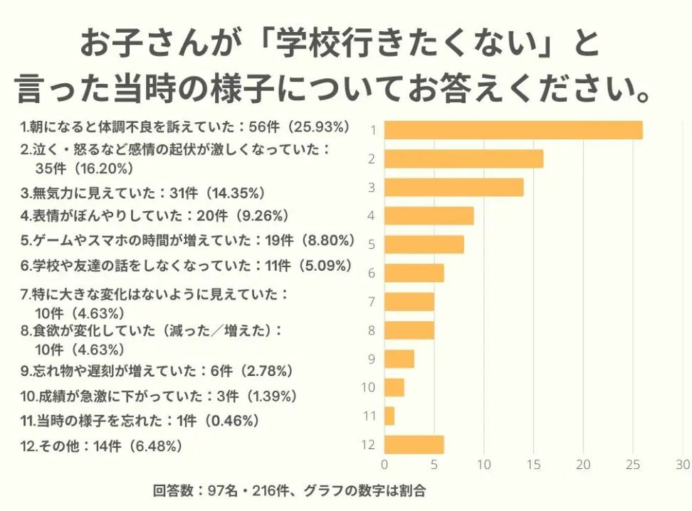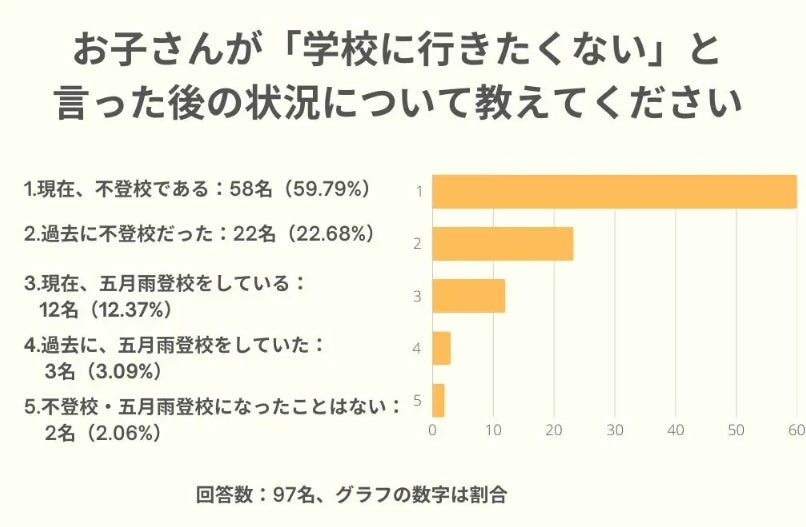 ※1:ご回答全体は102名で、うち、お子さんが「学校に行きたくない」と発言されたことのある方が97名でした。以下、その97名の結果についてお伝えします。
