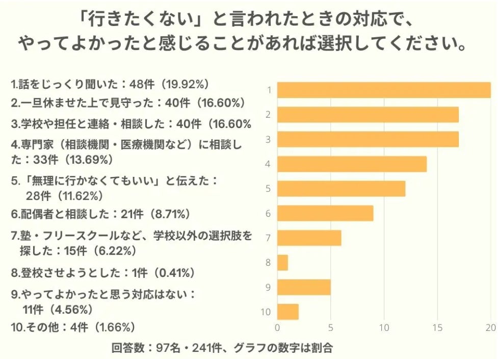 「行きたくない」と言われた際に「やってよかった対応」として最も多かったのは、「話をじっくり聞いた」でした。続いて「一旦休ませて見守った」「学校や担任に相談した」が上位に並び、無理をさせない姿勢と、支援者との連携が鍵となっていることがうかがえます。