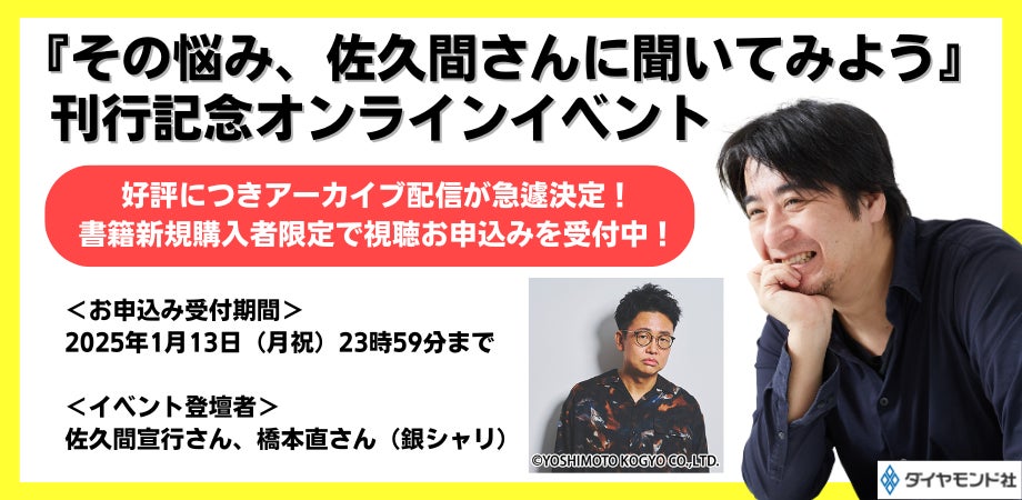 株式会社ダイヤモンド社は、今月12月9日(月)に開催した『その悩み、佐久間さんに聞いてみよう』(佐久間宣行:著)の刊行記念オンラインイベントのアーカイブ配信を決定しました。本日から2025年1月13日(月祝)までの期間、対象書籍の新規購入者限定でアーカイブ視聴のお申込みを受付します。