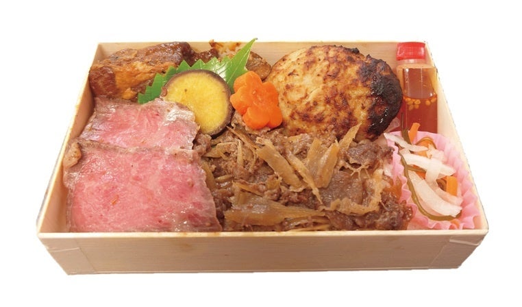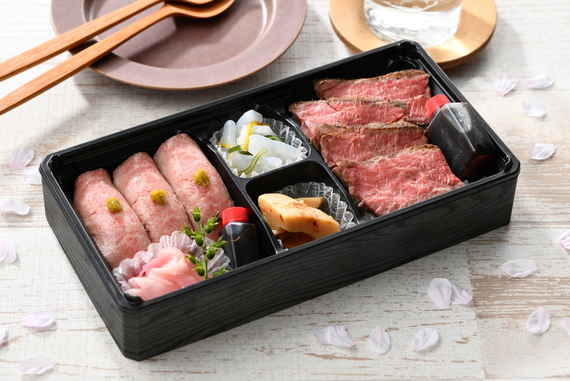 福岡発の老舗精肉店が手掛ける肉惣菜専門店。くちどけのよい絶妙な厚さに切落し低温でじっくりと焼き上げた霜降り肉の「和牛肉寿し」と、肩ロース肉を専用スパイスのみで焼くことで肉本来の旨味を引き出す「牛グリルステーキ」、同店の2大看板商品を一度に楽しめる京王百貨店限定弁当です。