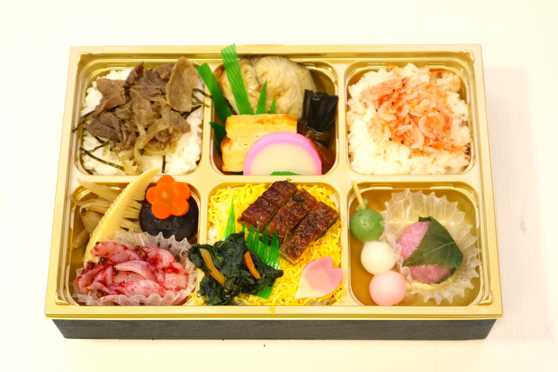 愛知県名古屋駅の「天下とり御飯」※などが人気の1922年創業の老舗調製元「松浦商店」。愛知県産ウナギの「うなぎごはん」と「牛のすき煮ごはん」、春が旬の「桜えびごはん」の3種が食べ比べできるほか、自家製の煮物、焼き魚などを詰め合わせました。桜餅と3色団子の甘味が彩りを添えます。