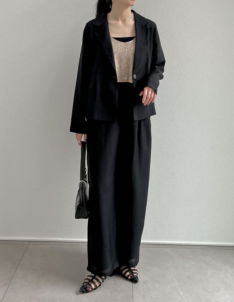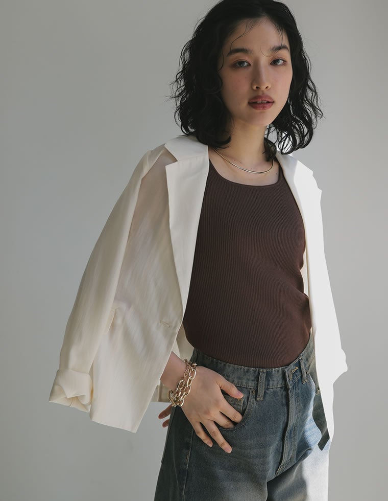 透け感と光沢が上品な印象を与え、カジュアルながらも大人モードなスタイリングが叶うテーラードジャケットです。
