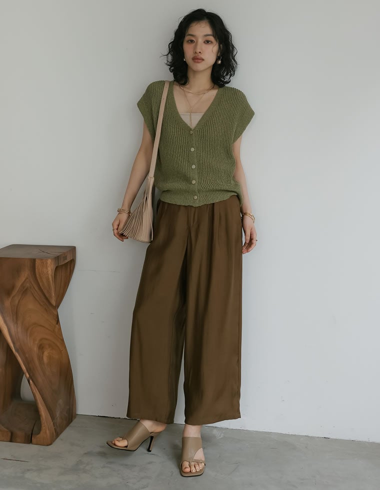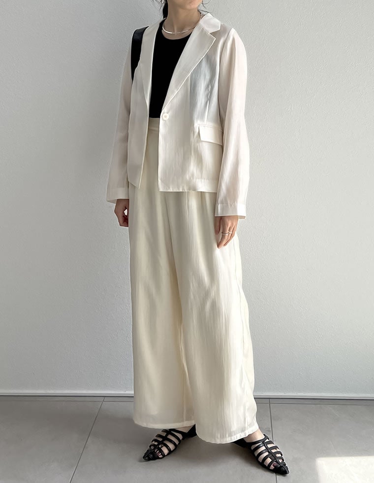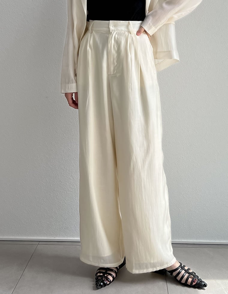 オーガンジーの様な光沢&シアー感のある素材を仕様した、タックワイドパンツ。