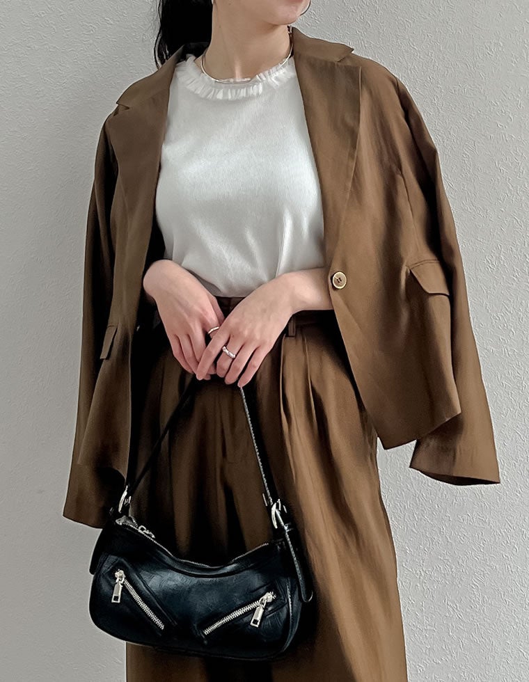光沢が上品な印象を与え、カジュアルながらも大人モードなスタイリングが叶う1着です。