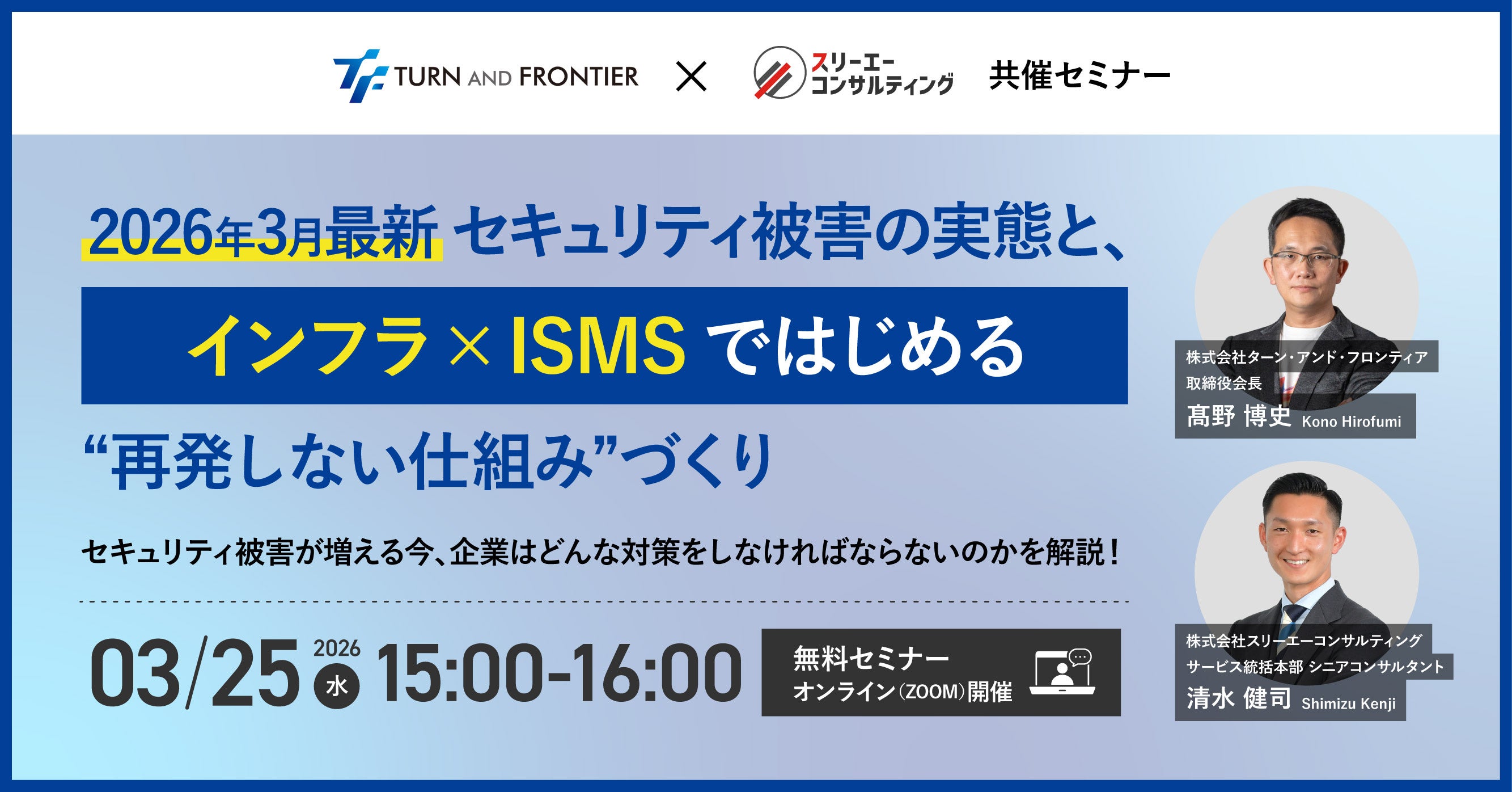 【ターン・アンド・フロンティア × スリーエーコンサルティング|共催】3/25(水)15:00-16:00 無料ウェビナー。最新セキュリティ被害とインフラ×ISMSで“再発しない仕組み”を解説。