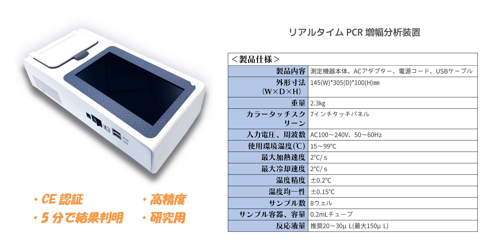 従来のPCR検査装置は大型かつ高価格のため、簡単に導入ができない、検査時間も長いなどの問題点がありました。