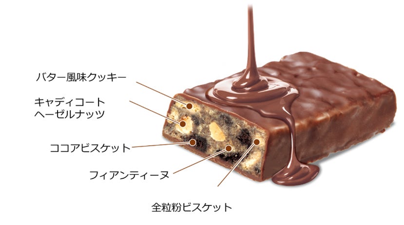 「うっとりジャンドゥーヤ」は、濃くてリッチな味わいが特長のジャンドゥーヤチョコバーです。焦がしバターの香ばしいコクと、コーヒーパウダーによるほのかな苦みを隠し味に加え、甘さに奥行きを持たせています。さらに、キャンディコートヘーゼルナッツ、フィアンティーヌ、全粒粉ビスケット、バター風味クッキー、ココアビスケットの5種の素材が織りなすザクザクとした多層的な食感がクセになり、冬のひとときを「うっとり」とさせる贅沢感をお届けします。