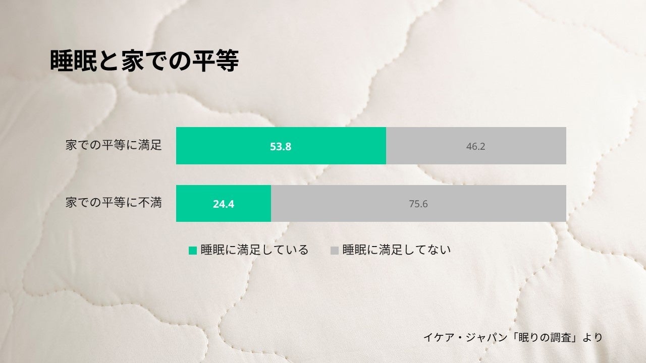 このように、睡眠には、家での暮らしにおけるさまざまなアクティビティや要素が関連しているため、イケアでは、家での暮らしのさまざまな角度からよりよい睡眠のためのインスピレーションを届けたいと考えています。その一つの例として、私たちは睡眠におけるジェンダーギャップにも注目しています。2021年版の経済協力開発機構(OECD)の調査では、33カ国中、日本人の平均睡眠時間は最短で、また男性より女性のほうがさらに短かったことから、日本の女性は世界で最も寝ていないとも言われています。その要因の一つとして家事や育児などの女性への偏りがあげられます。今回の調査では、家での平等に不満のある方は、睡眠だけでなく家での暮らし自体にも不満を感じる割合が高いことがわかりました。