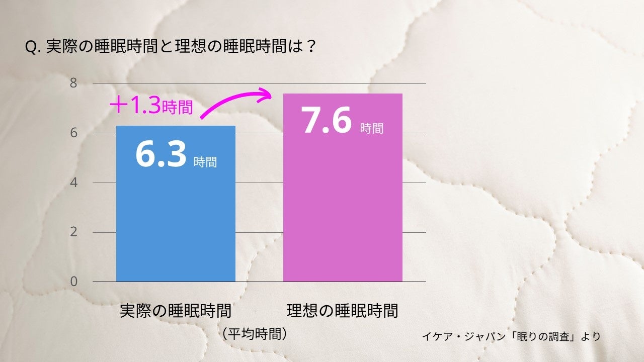 調査によると半数以上(56.8%)が睡眠に満足していないと回答し、それぞれの理想の睡眠時間と実際の睡眠時間を比較したところ理想の全体平均の睡眠時間は約7.6時間にもかかわらず、実施平均は約6.3時間と約1.3時間少ないことがわかりました。