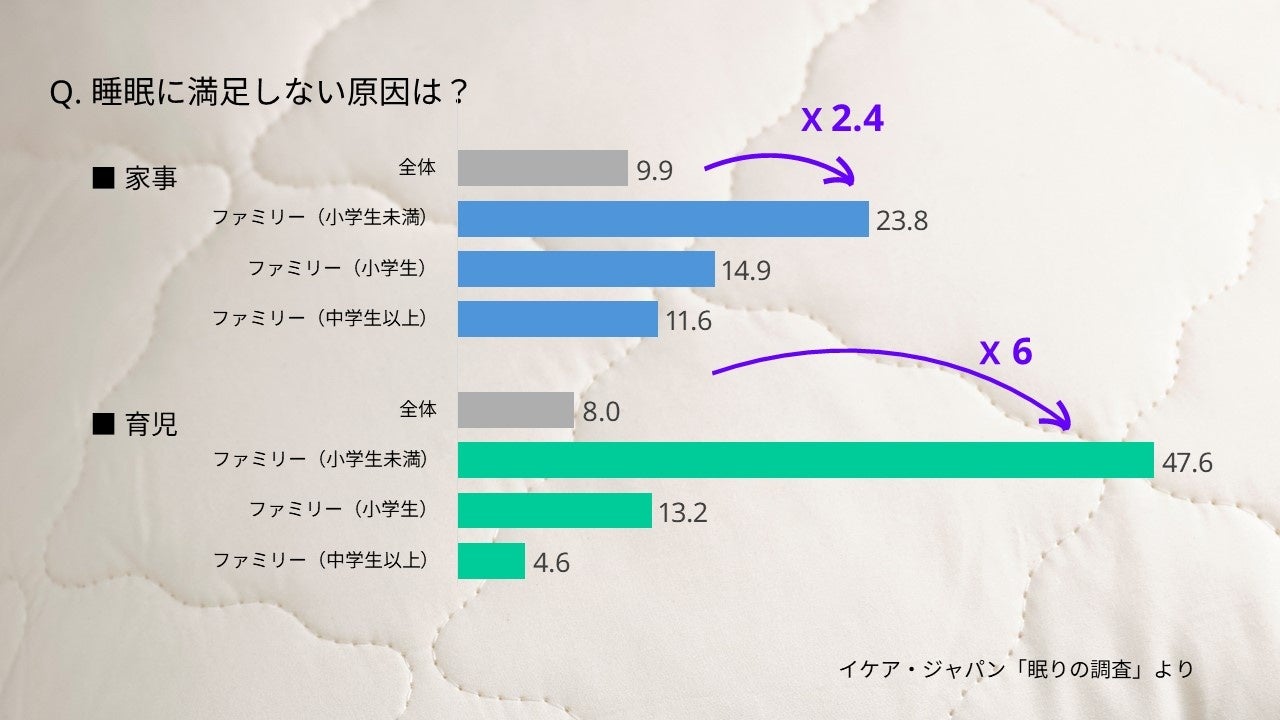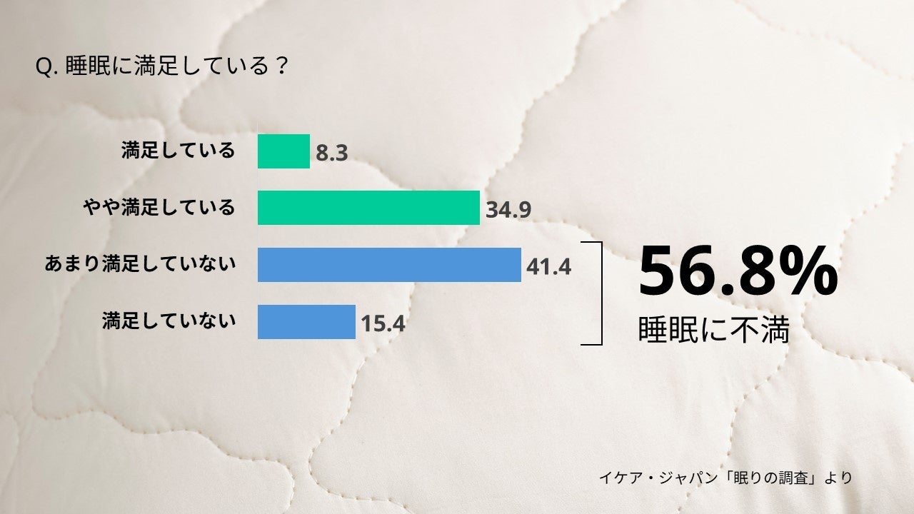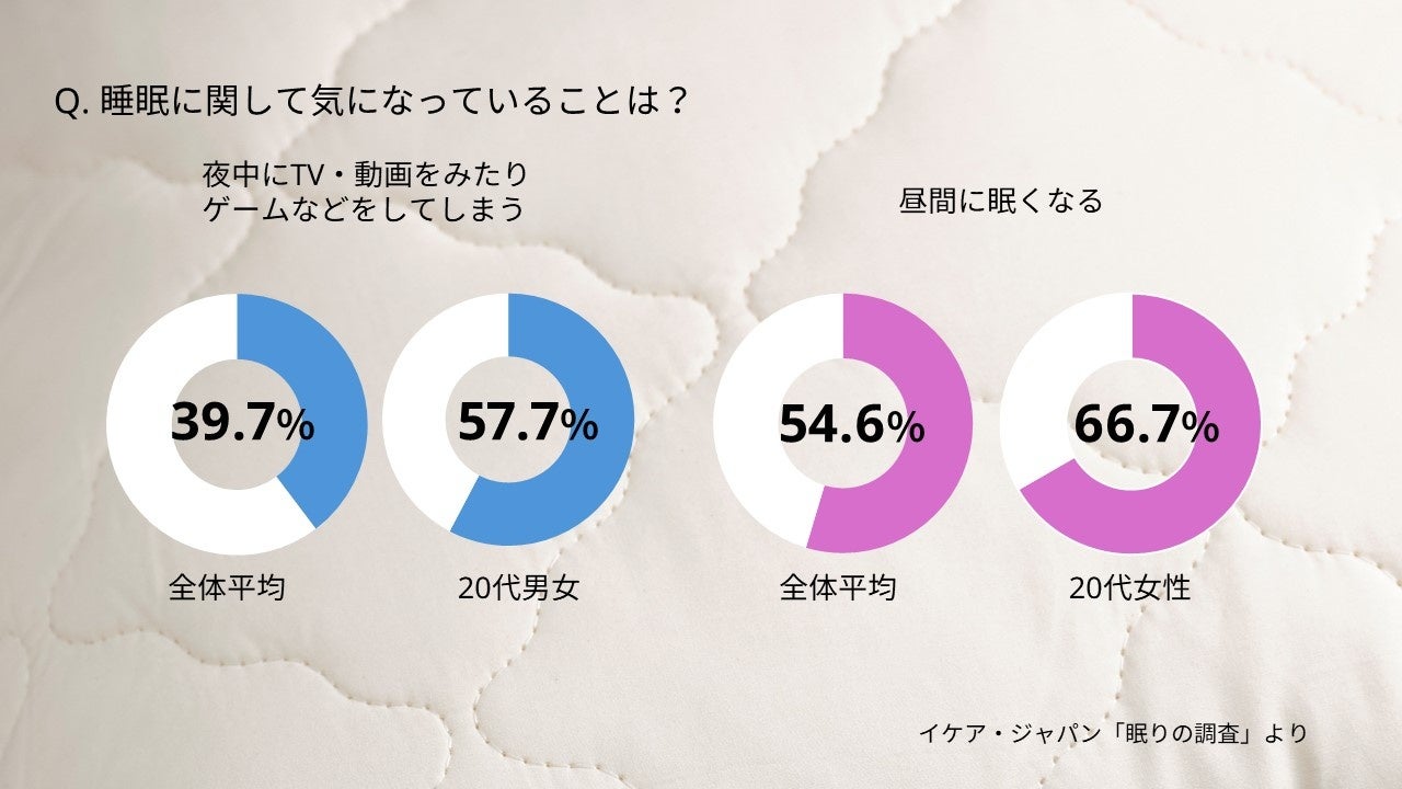 イケアでは、家でのよりよい暮らしに良質な睡眠は必要不可欠と考えており、睡眠に関わる商品やソリューションを展開し、皆さまの眠りをサポートしています。イケアがグローバルで行った調査Life at Home Report(https://www.ikea.com/jp/ja/files/pdf/d6/a4/d6a42b9a/ikea-life-at-home-report-2023-ja.pdf)によると、世界では55%の人(日本では51%)が「眠り」は家での暮らしにおいて最も重要かつ健康的な活動であると考えていると回答している一方で、多くの研究によると成人の2人に1人が現状の睡眠において不満を持っていることが分かっています。多くの人がよりよい暮らしにとって重要だと考える睡眠が、さまざまな世代の人たちにとっての深刻な課題になっています。ライフスタイルが多様化する中で、家の中の役割、特に幼い子どもを持つ親としての責任がある子育て世代、また、夜間の仕事や仕事の掛け持ちなど、生活が不規則になりがちな職業に就いている現役世代など、多忙な日常は良質な睡眠が妨げられる原因となります。またテクノロジーの進化により子どもから大人までスマートフォンやゲームなど電子機器の使用の増加が睡眠に悪影響を及ぼすことが分かっています。
