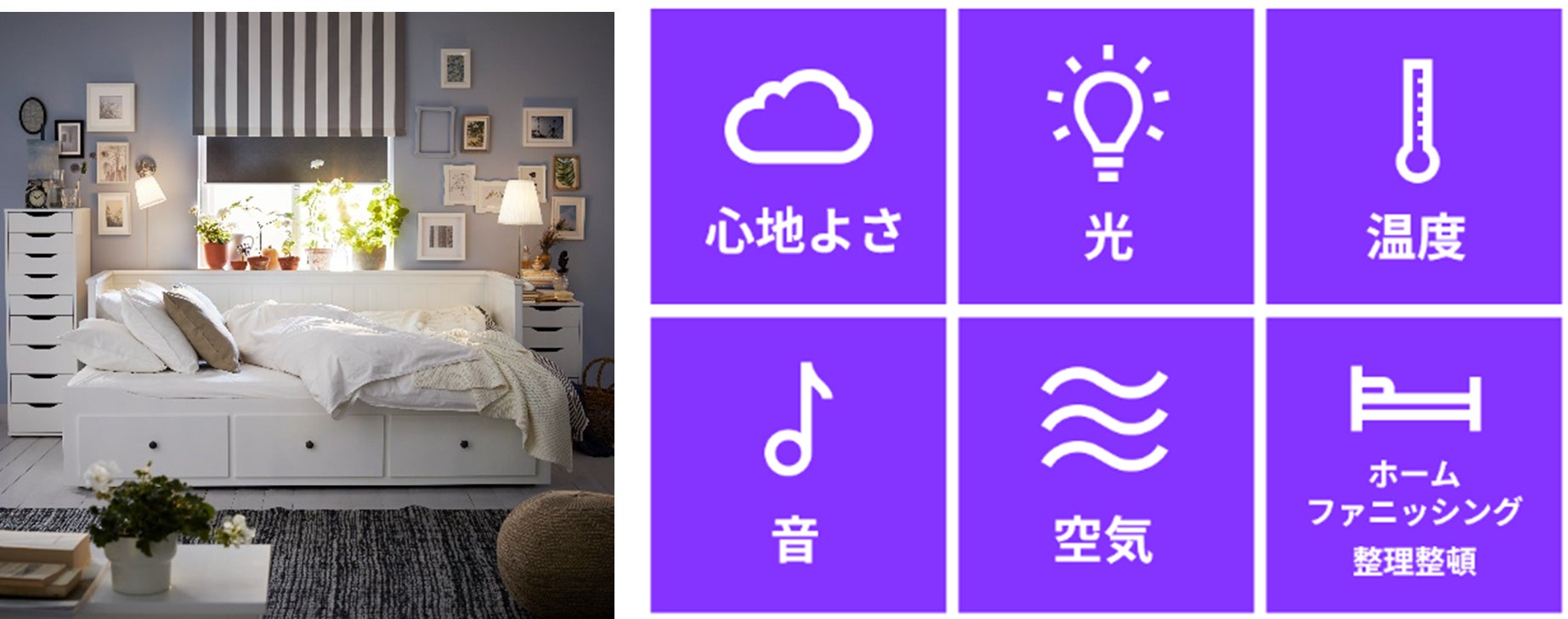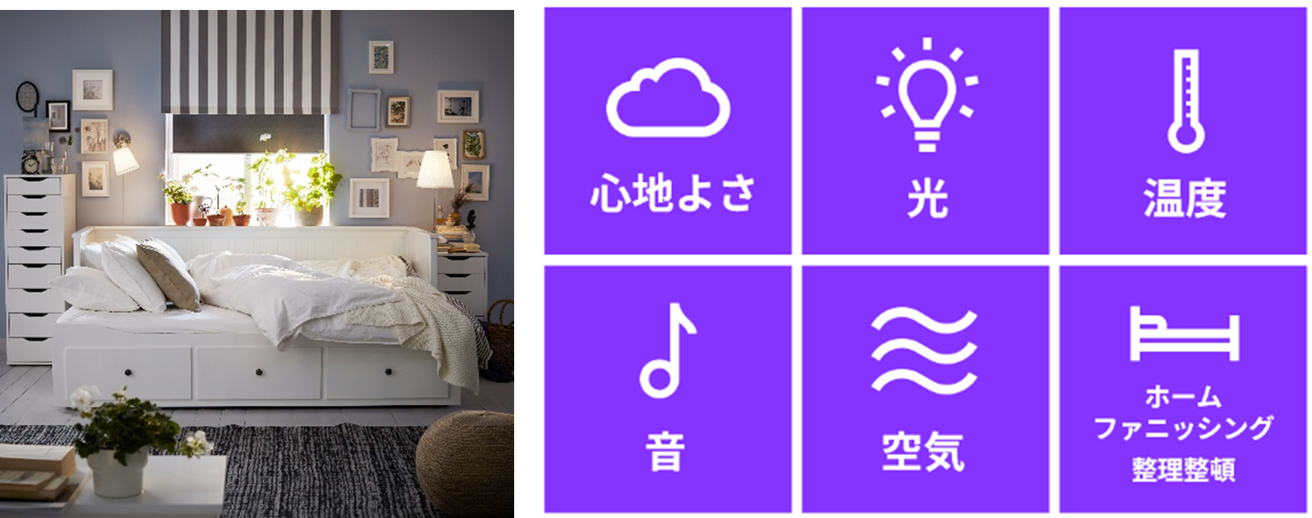心地よさ:寝心地の良いマットレス、自分の寝姿勢に合った枕、そして快適な布団は快適な眠りに欠かせません。寝る時の姿勢によって、適切なベッドの硬さは異なります。また、枕選びは、個々の好みだけではなく、寝姿勢やマットレスとの相性も大切です。イケアでは、10種類以上のマットレス、15種類以上の枕、10種類以上の掛け布団を用意し、コワーカーが皆さまにぴったりのマットレス、枕、布団探しをサポートします。ご購入いただいたマットレス、枕、布団が万が一合わなくても、90日間以内なら交換可能です。