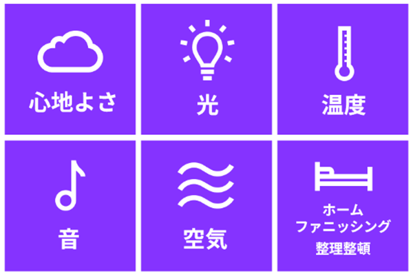音:『コンプリート・スリープ』の寝室は、不要な音を防ぎ安らぐことができる場所。しかし環境によって防音は難しい場合は、厚手のカーテンやカーペットなどは、振動やパートナー、お子さまの足音を和らげるのに役立ちます。