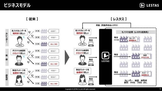 カスタムオーダー品を既存のプラットフォームで購入するには、UXが最適化されておらず、また対面販売も工数が多く、小ロットの場合は特に適正価格での販売が困難でした。レスタスは独自開発のシステムによって、簡単にカスタムオーダー品を購入でき、小ロットでも適正な価格で販売、また多重請負構造によって低収益性になっている、中小零細製造業とダイレクトで取引することで、中小製造業のDX化(高収益化)と地域活性に繋がっていると考えます。11年前、名入れカレンダーのEC販売からスタートしたレスタスは現在、4,000アイテムを超えるカスタムオーダー品を取り扱い、また年間法人約2万社、個人約18万人が取引するプラットフォーマーとして成長することができました。今回のご出資を機にちゅうぎんキャピタルパートナーズ様と一緒に中四国地方の協力会社様との提携を通じて、当社の中期目標である「日本を代表するファストカスタムオーダーカンパニー」を実現できるようにレスタス社員一丸となって邁進して参ります。