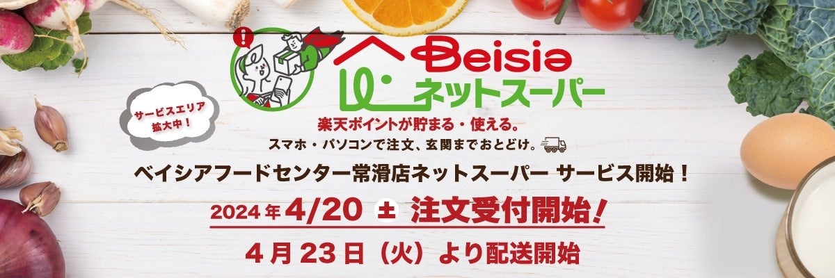 株式会社ベイシア(本社:群馬県前橋市、代表取締役社長:相木孝仁)は、楽天グループ株式会社(以下「楽天」)が提供するネットスーパーのプラットフォーム「楽天全国スーパー」内に出店する「ベイシアネットスーパー」において、ベイシアフードセンター常滑店からの配送を2024年4月23日(火)より開始いたします。