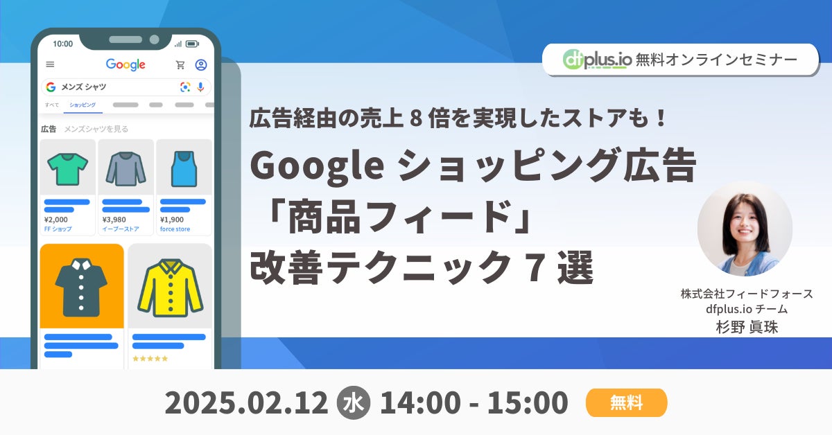 株式会社フィードフォース(所在地:東京都港区、代表取締役:塚田 耕司、以下「フィードフォース」)が提供する、マーケターのためのデータフィード管理ツール「dfplus.io」は、無料オンラインセミナー「Google ショッピング広告の商品フィード改善テクニック 7 選」を 2025 年 2 月 12 日(水)に開催いたします。