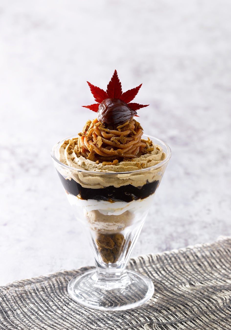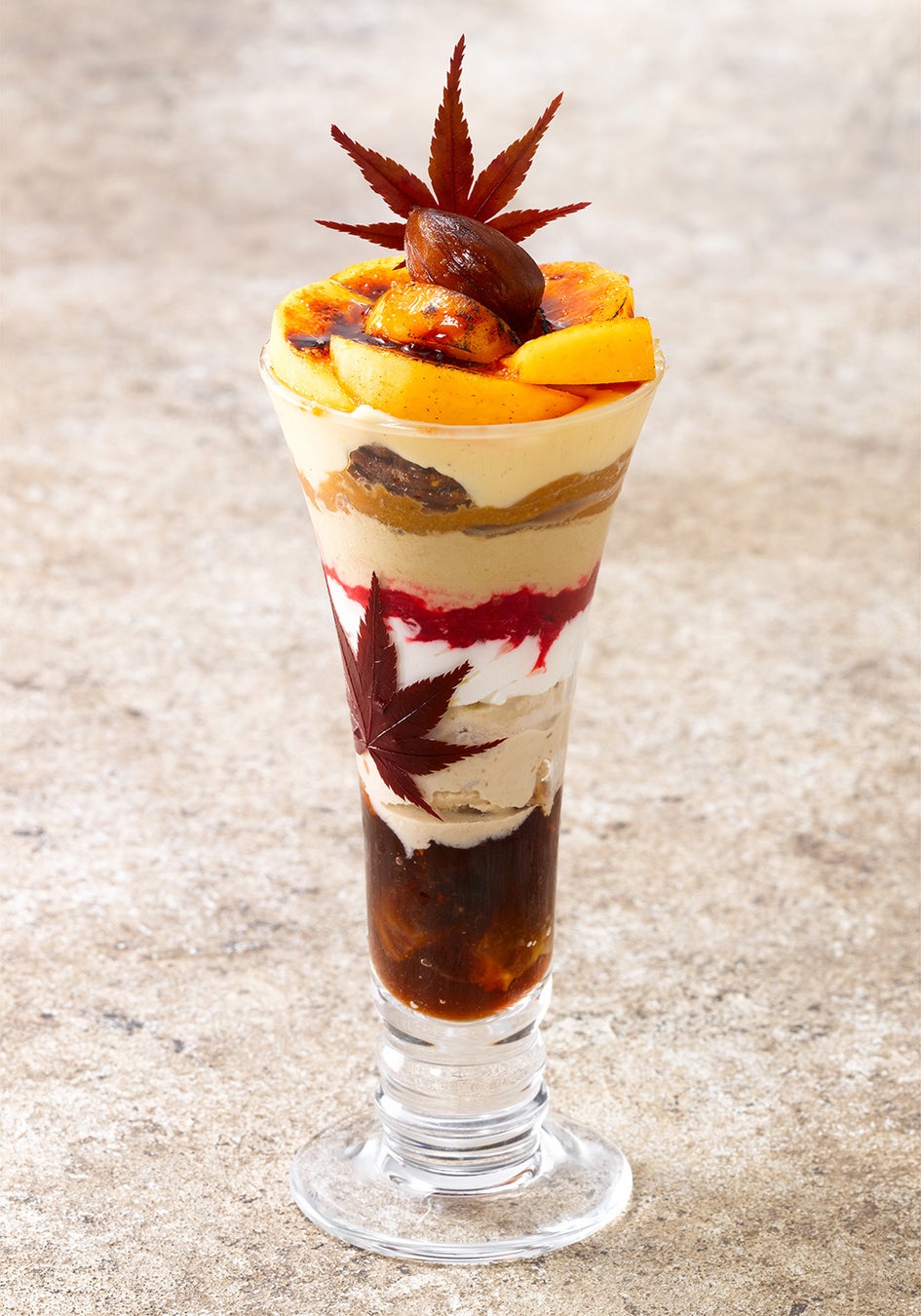 グラスの中に、ほうじ茶ゼリー、メレンゲ、ピーカンナッツ、シフォンケーキ、柿、渋皮栗アイスなどを盛り込み、トップに渋皮栗を添えた秋を彩るパフェ。仕上げに金箔パウダー※とツイストチョコレートを飾りました。