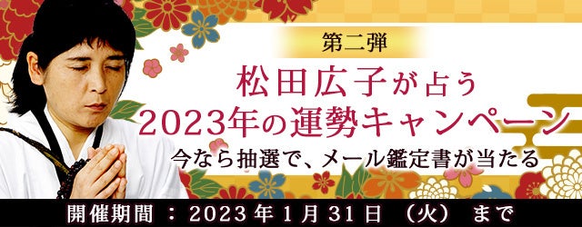 松田広子の公式占いサイト「恐山の秘術【最後のイタコ】松田広子」では、『2023年の運勢キャンペーン第二弾』を開催中です。期間中、キャンペーン対象鑑定の鑑定ページよりご応募いただいた方から抽選で3名様に、「松田広子が直接占うメール鑑定書【2023年のあなたの運勢】」をプレゼントいたします。あなたの2023年の運勢を丁寧に鑑定していきますので、この機会に是非ご参加ください。