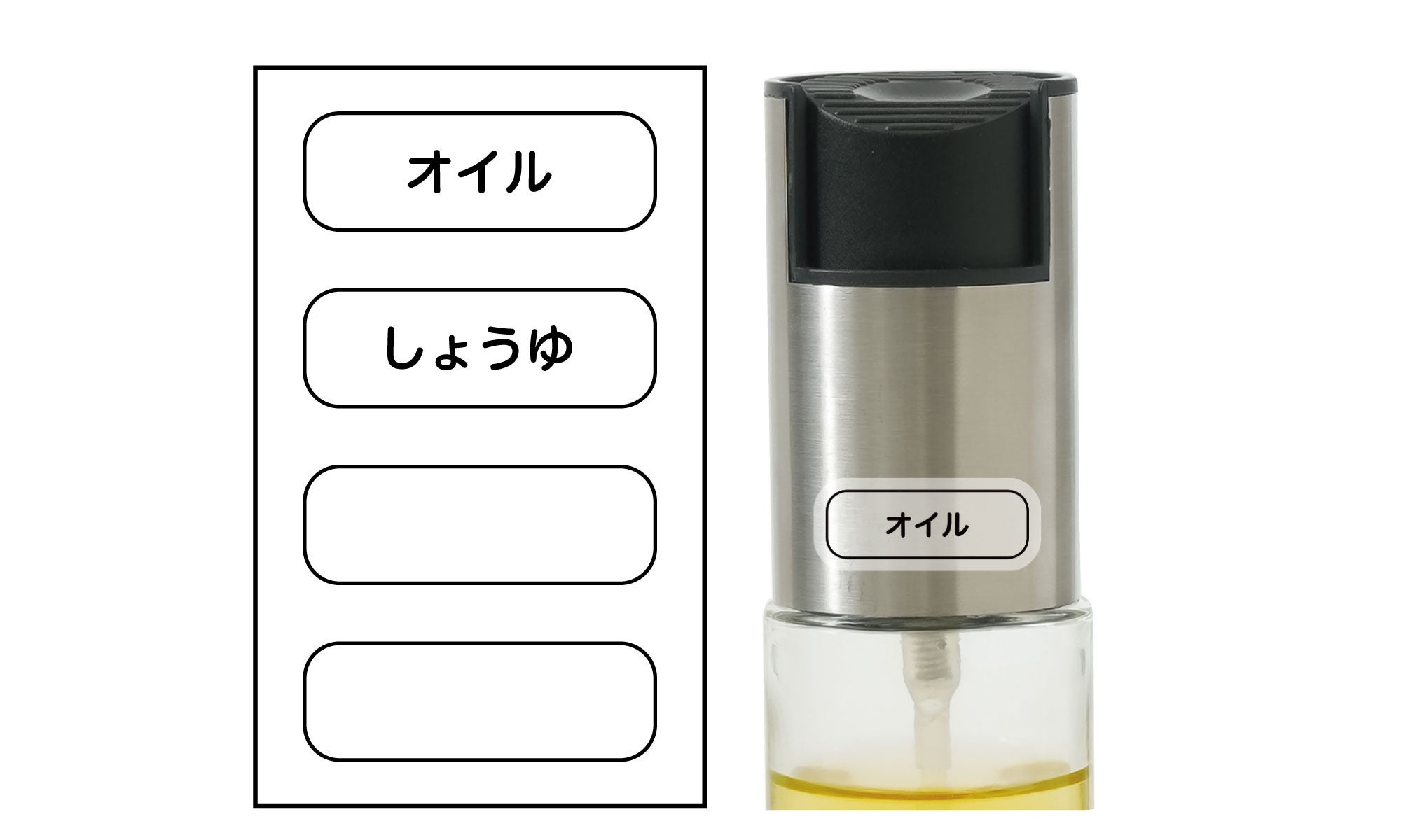 何が入っているのか一目で分かる便利なラベリングシール付き。オイル・しょうゆ以外の物にも名前や日付を手書きできるブランクラベルも付属。