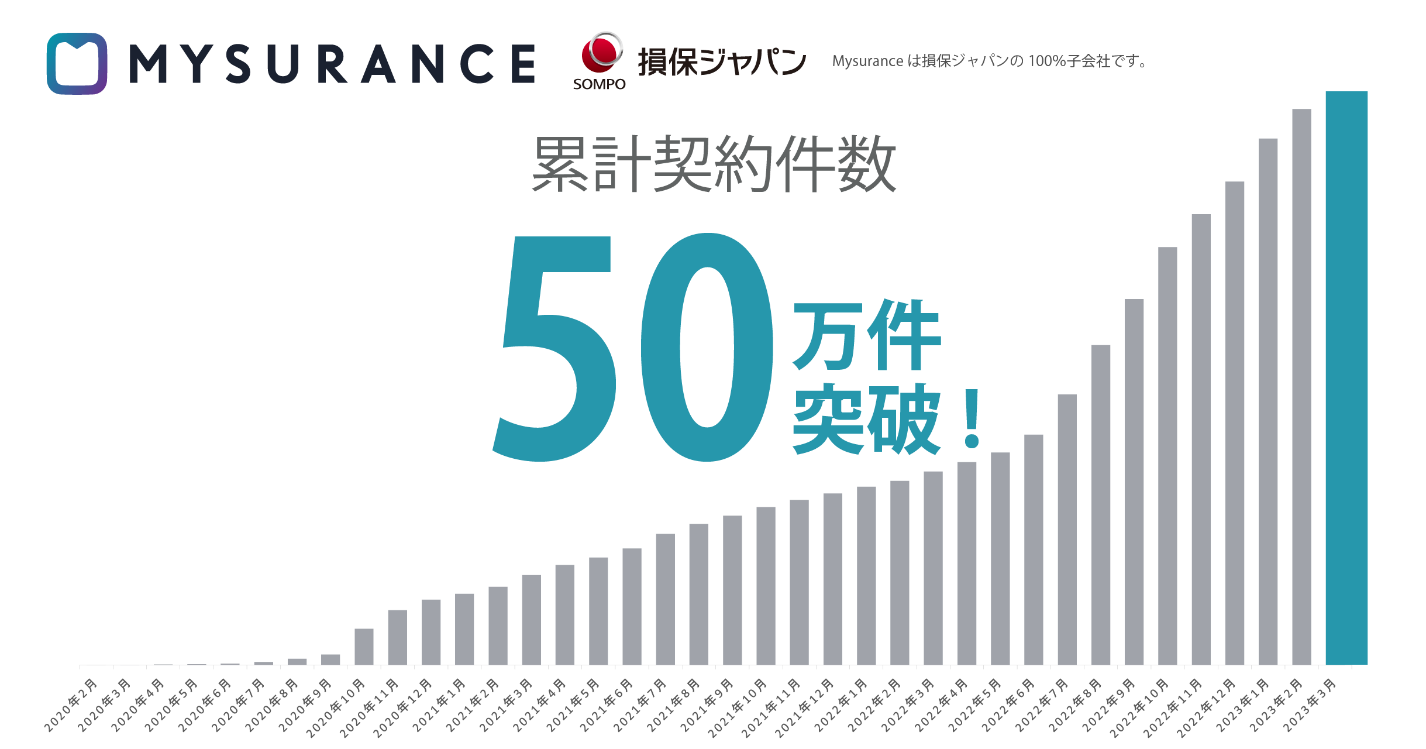 損害保険ジャパン株式会社(代表取締役社長:白川 儀一、以下「損保ジャパン」)の子会社で少額短期保険業を営むMysurance株式会社(代表取締役社長:桐山 正弘、以下「Mysurance」)は、2023年3月13日に累計契約件数が50万件を突破したことをお知らせします。