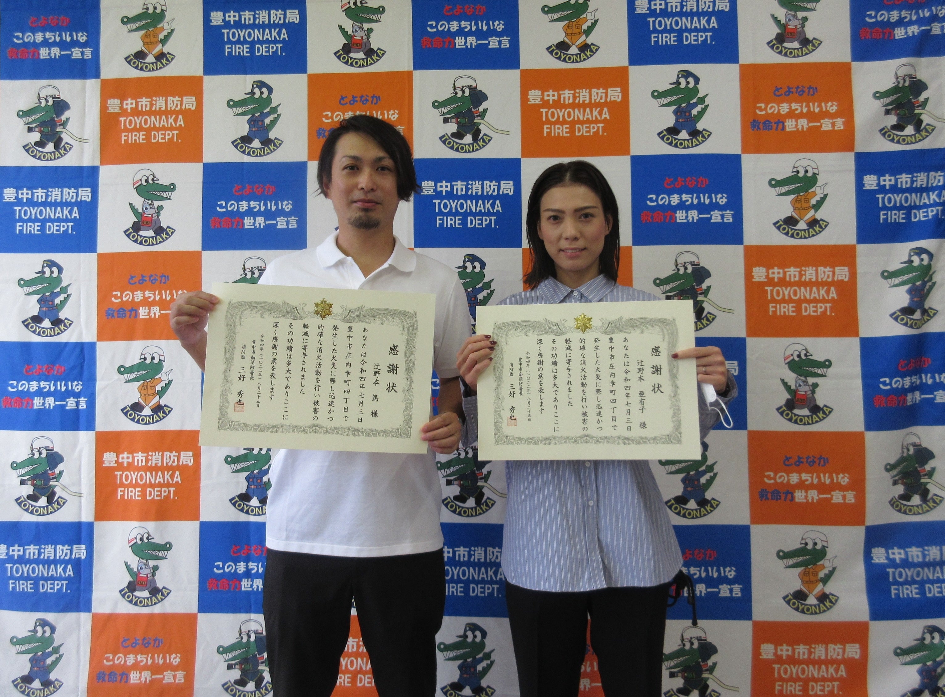 豊中市南消防署(署長:三好秀也)は、令和4年(2022年)7月3日(日)に本市庄内幸町4丁目にある住宅の出窓内に炎を発見し、通報と初期消火を行った夫婦に対し、その勇気ある行動をたたえ、南消防署長から感謝状を贈呈しました。