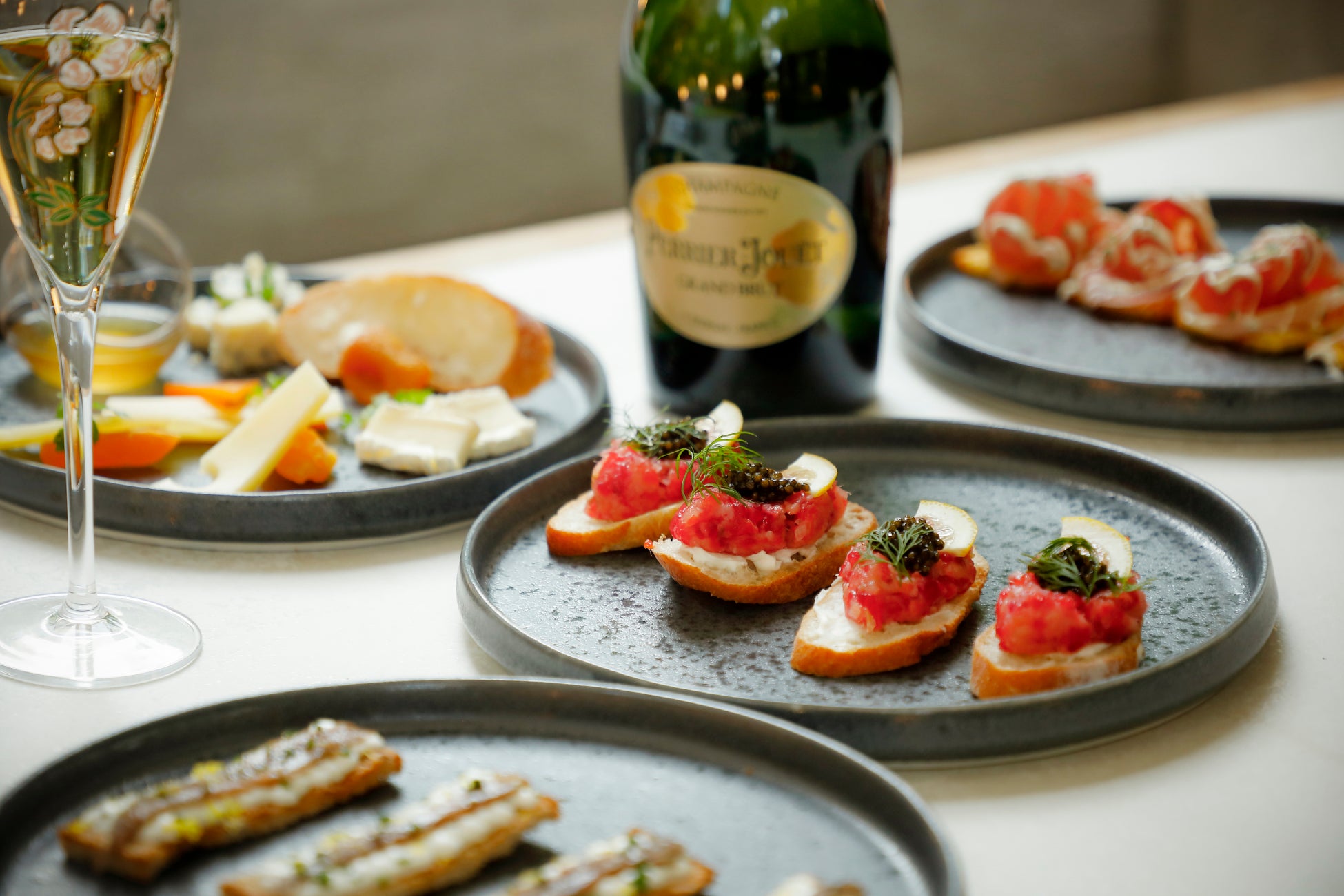 本プランでは、「ペリエ ジュエ グラン ブリュット」を含む90分のフリーフロープランに、シェフが手がけるカナッペ3種を添えてご提供。みずみずしい季節の恵みを感じさせる味わいと、エレガントな泡とのマリアージュが、午後のひとときを洗練されたひと幕へと導きます。