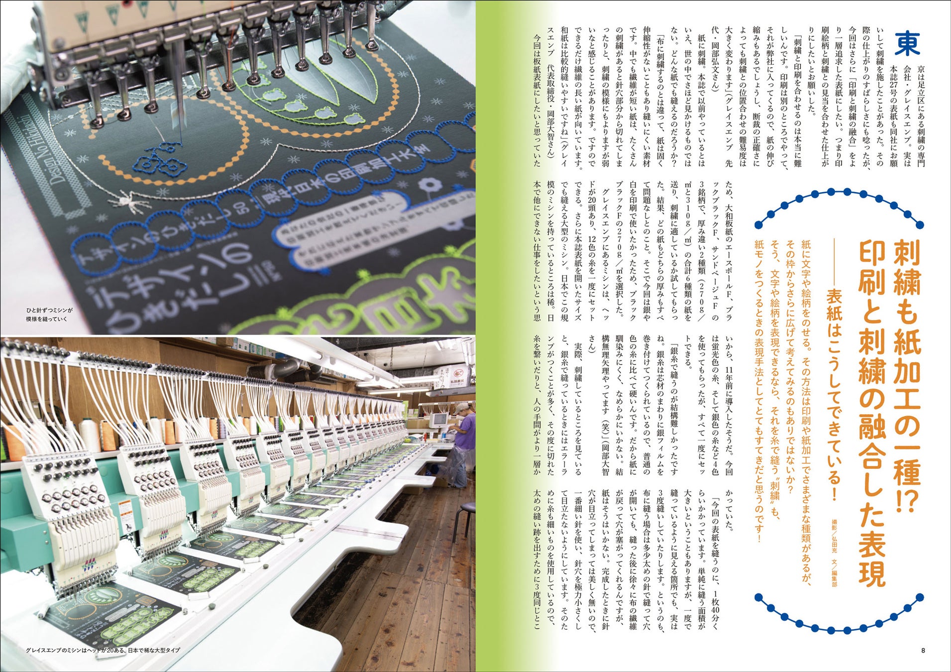 印刷や紙加工からさらに発想を広げ、紙を糸で縫う“刺繍”という表現手法を使った今号の表紙についても紹介!