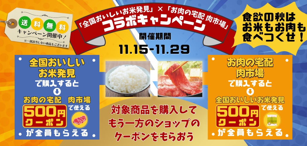 このキャンペーンは、新米の季節と11月29日(いい肉の日)に合わせ、「全国おいしいお米発見」で商品を購入した方には「お肉の宅配」の500円クーポン、「お肉の宅配 肉市場」で商品を購入した方には「全国おいしいお米発見」の500円クーポンをプレゼントします。