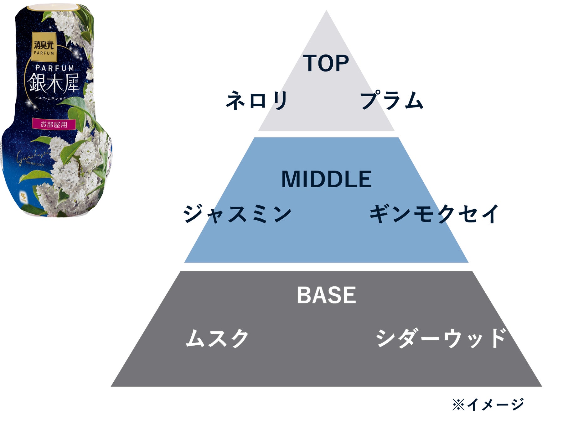 ①気品高いギンモクセイを中心としたホワイトフローラル調の香りです。