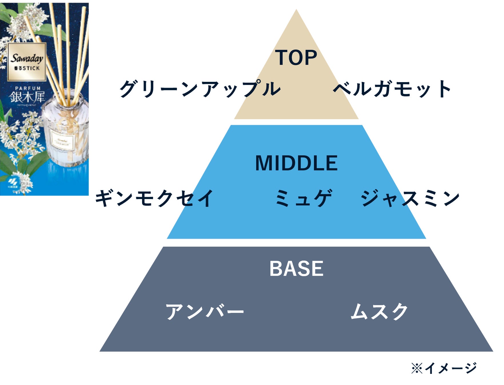 ギンモクセイの清潔感あふれるフローラルの香りに、ほんのり甘いプラムをアクセントに加え、ムスクやウッディでまとめたフローラルフルーティー調の香りです。