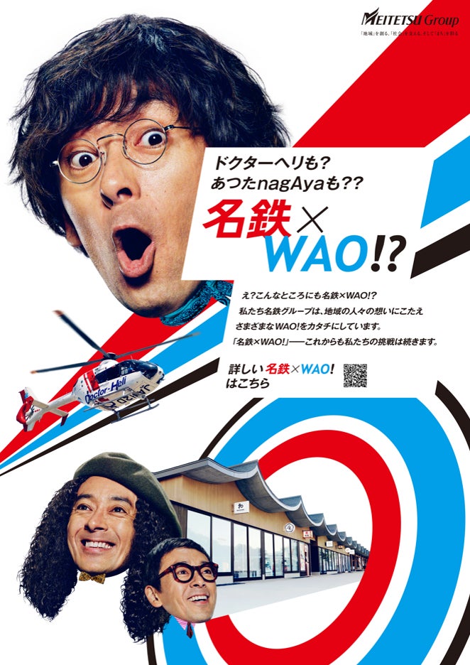 名古屋鉄道は、「名鉄×WAO!」のシリーズ広告の第2弾として「ドクターヘリ編」「あつたnagAya編」を12月23日より展開します。また、「名鉄×WAO!」ラッピング電車も運行します。