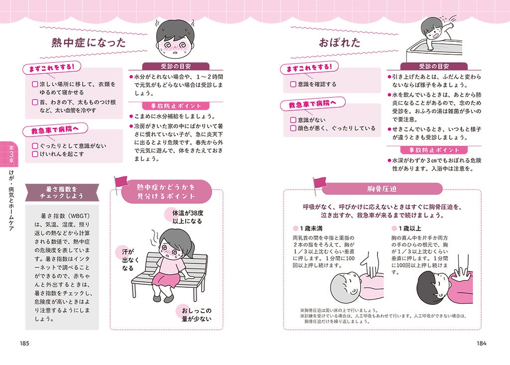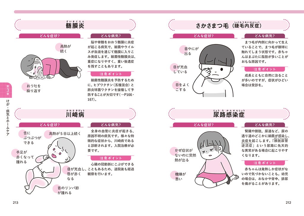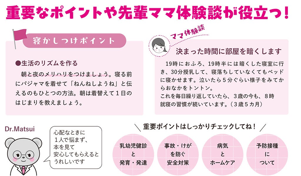 まんがの間には、子どもの発達や生活上ポイント、ケガや病気のことまで、育児を補足する記事を小児科医監修でつくっています。育児にまつわる最新の正しい情報が網羅されているので、困ったときには、ネット検索に頼ることなく、すぐに本書の中から必要な情報を見つけることができます。