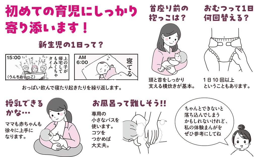 まんがは、新生児期から子どもの発達・成長に合わせて進んでいきます。時期ごとに多くのママがぶつかる悩みにスポットを当て、悩めるママパパを細やかにフォローします。