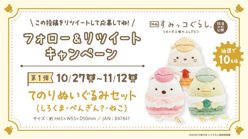 X(旧Twitter)にて、映画公式グッズの「てのりぬいぐるみセット(しろくま・ぺんぎん?・ねこ)」が抽選で10名様に当たるフォロー&リツイートキャンペーンを実施します。はま寿司公式X(旧Twitter)の投稿をご確認の上、ぜひご参加ください。