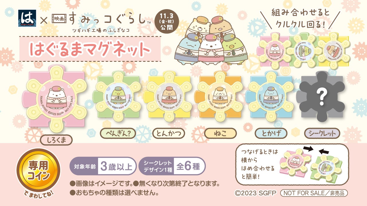 「はぐるまマグネット」は、複数個をはめ合わせ連動させることで、クルクル回して遊ぶおもちゃです。お子様から大人まで、幅広い年代のすみっコぐらしファンに喜んでいただけるアイテムです。シークレット1種を含む全6種を集め、はぐるまのように回してお楽しみください。