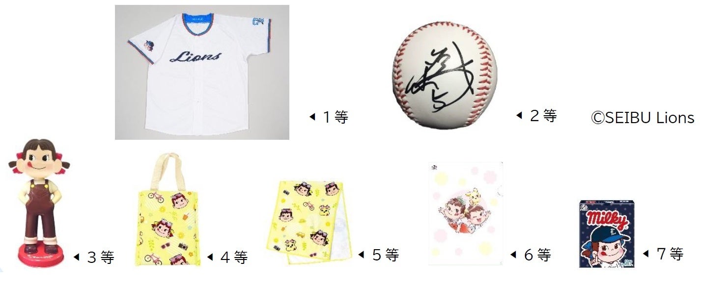 当日ご来場いただいた方の中から抽選で5名様に、「ペコちゃんHappyセット」をプレゼント! チケットに記載されている座席番号にて抽選を行います。当選座席番号は、7回裏終了時にLビジョンにて発表いたします。