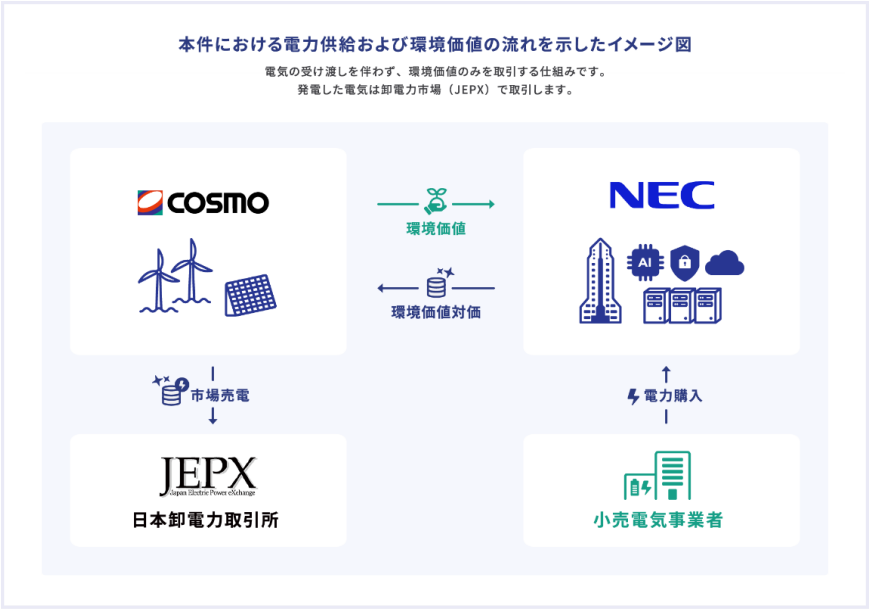 コスモエネルギーホールディングス株式会社(代表取締役社長:山田 茂)のグループ会社であるコスモエコパワー株式会社(代表取締役社長:野倉 史章、以下「コスモエコパワー」)は、日本電気株式会社(取締役 代表執行役社長:森田 隆之、以下「NEC」)と、2025年12月25日付で、コーポレートPPA※1(以下「本PPA」)を締結したことをお知らせします。