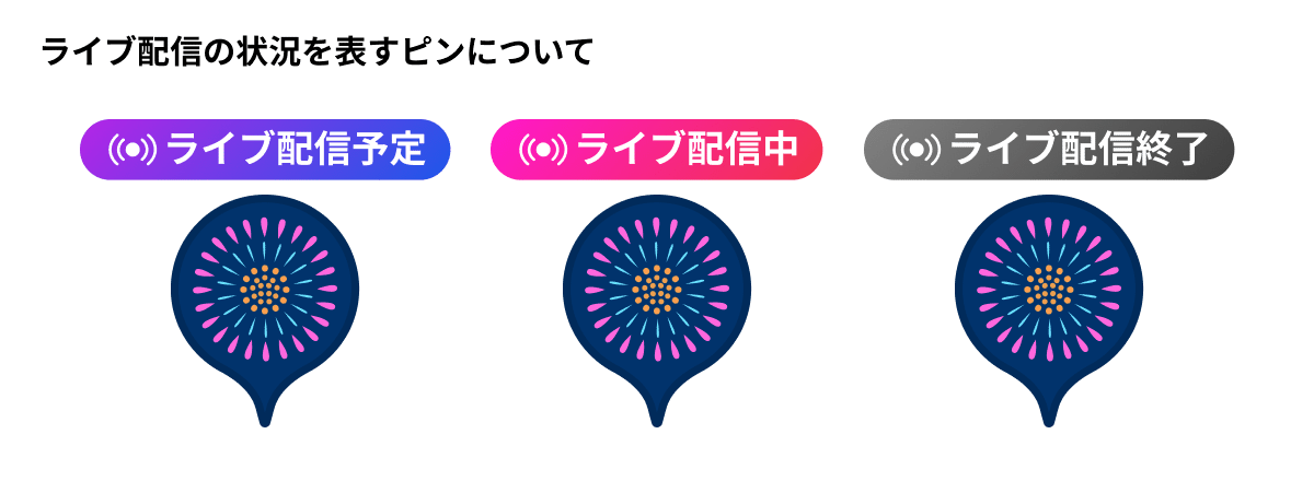 ライブ配信の状況はピンの上に3種類のラベルで表示します。(「ライブ配信予定」「ライブ配信中」「ライブ配信終了」)