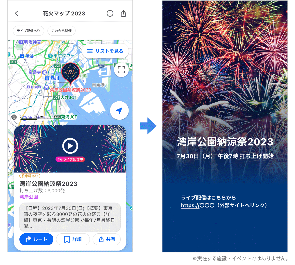 ・「ライブ配信中」が表示されているピンをタップすると、詳細画面から花火大会の公式サイトへ遷移し、ライブ動画を視聴できます(※6)。