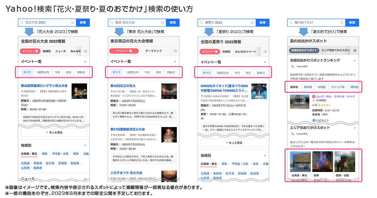 ~ Yahoo!マップでは、今年はライブ配信施設の絞り込み機能の提供や打ち上げ数・打ち上げ時間なども確認可能に。Yahoo!検索では、「夏祭り」情報の提供や「夏のおでかけ」と検索すると夏の外出に役立つ情報も掲載 ~