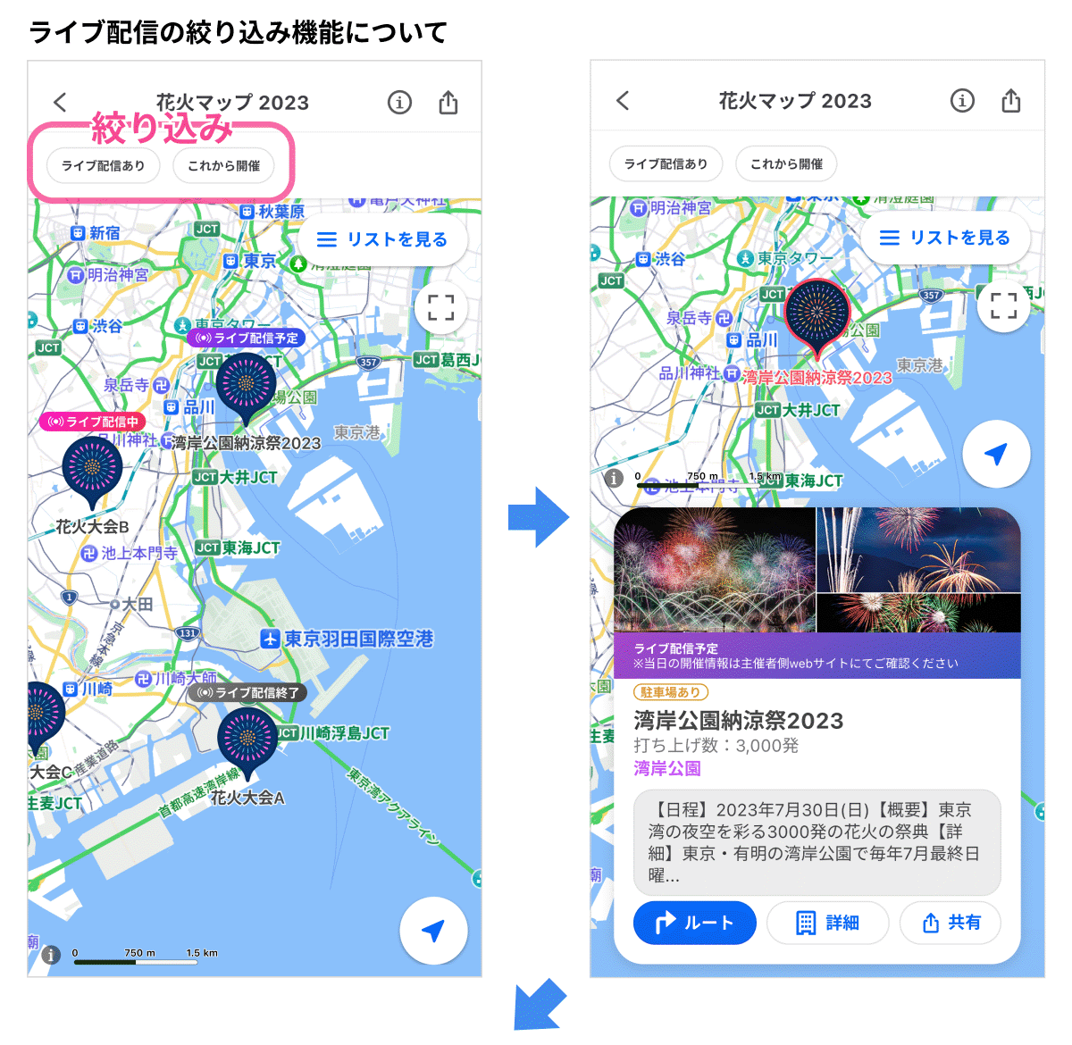 本機能は、地図上から花火大会の開催スポットの写真・施設名・イベント名・開催日程・概要・詳細などが確認できるほか、今年はユーザーからの声を反映し要望の多かった花火の打ち上げ数・打ち上げ時間・昨年の人出の項目も確認できます(※4)。さらに、今年は、会場に行くことができない方や人混みが気になるという方に向けて、ライブ配信の有無を確認できる絞り込み機能も新たに追加しました。ライブ配信が開始されると、該当スポットのピンの上に「ライブ配信中」と表示され、該当スポットのピンをタップすると、公式サイトへ遷移し、リアルタイムでライブ配信を楽しむことができます。