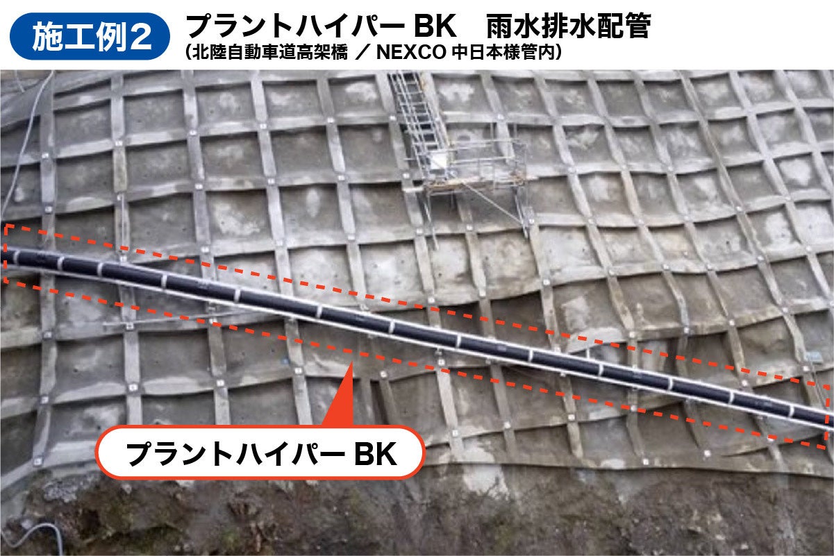 なかでも道路の高架橋の雨水排水配管については、冬季の凍結防止剤の散布等により鉄管の腐食が問題となっており、軽量化と長期の維持管理の観点から、「プラントハイパーBK」の採用が増加しています。