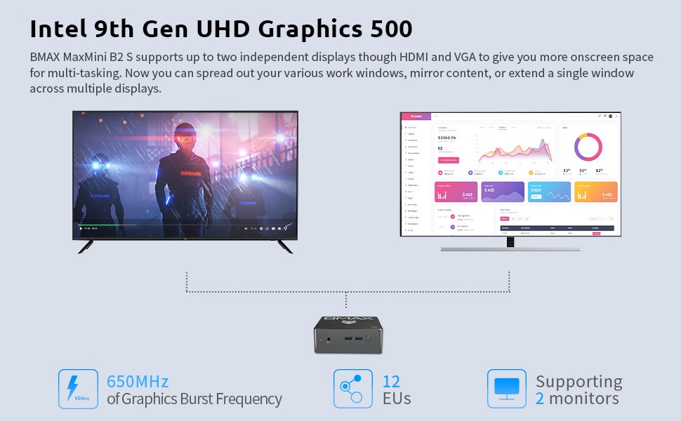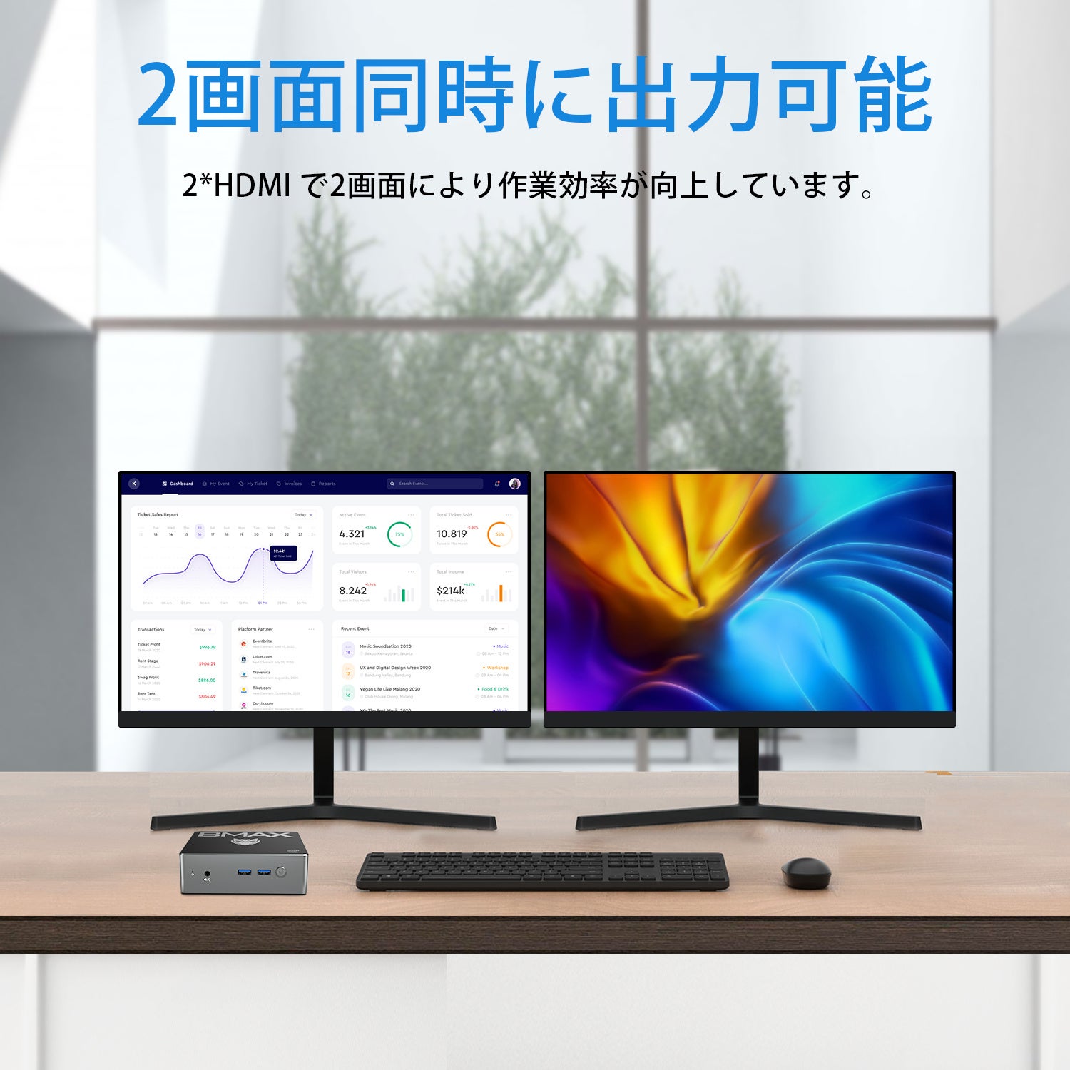 4x USB 3.0 、1x HDMI (4K Ultra HD出力)、1xイヤホン/マイクジャック、1xイーサネットポート(1000Mb LANに対応)、1 x DC電源入力ポート、1x VGA。また、HDMI+VGA接続により、最大2台のモニターでマルチディスプレイを構築することができます。仕事と遊びを同時に、1 台のB2 Sで簡単に実行できます。2.4+5G Wi-Fi、1000M LANに対応し、ネットワークの高速化とパフォーマンスを保証します。