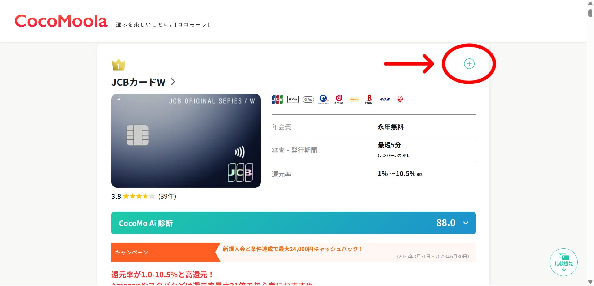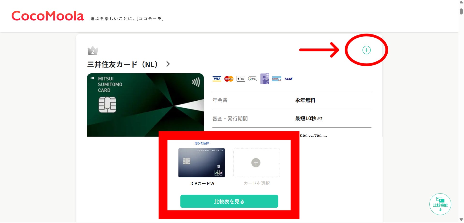 まず、比較したいクレジットカードを2枚選びます。比べたいカードが決まったら、1枚目のクレジットカードの右上にある⊕ボタンをクリックします。