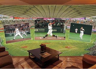 「IOWN」の特性である「大容量」と「低遅延」の特性を活かして、高解像度な中継映像だけでなく、選手のバッティングやピッチングなどをさまざまな角度からの視点に切り替えることができる自由視点映像や球場内の観客席を映した没入映像などの複数の映像を、現地から直接壁と床が映像で囲まれた空間(※5)(以下、没入空間)に同時に伝送します。これにより、球場で試合を観戦しているかのような体験ができる世界初の「IOWNを活用した新たなプロ野球観戦」の創出をめざします。本実証の結果をもとに、マンションの共用施設等での提供の検討を進めていきます。