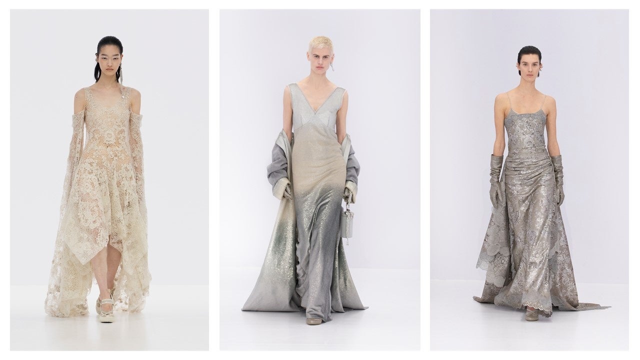 クチュールの伝統は人間味を加えて近づきやすくなり、輝きと透明感を放ちながら、軽やかで、着る人に心地よさを与えます。「コスチューム」としての仰々しさは控え、身にまとう女性たちの主体性に沿うしなやかさと、変化することへの追求を表現しています。ドレスのフォルムは流れるようなシルエットが強調され、アンサンブルのアイデアが新しい意味を帯びて復活し、意図的な絶え間ない変化とそれに適応する柔軟性が、頑なさに取って代わっています。ウィングドスリーブは取り外しのできるものが多く、ランジェリーはルックの一部としてデザインされており、外からは見えない場合でさえ緻密に刺しゅうが施され、意外性のある制作工程を経ています。中に着るお揃いのドレスと同じ精巧な刺しゅうが施されたコートは、リバーシブルで着ることも可能です。“エプロン”ラップスカートは、ストールとして身につけることもできます。