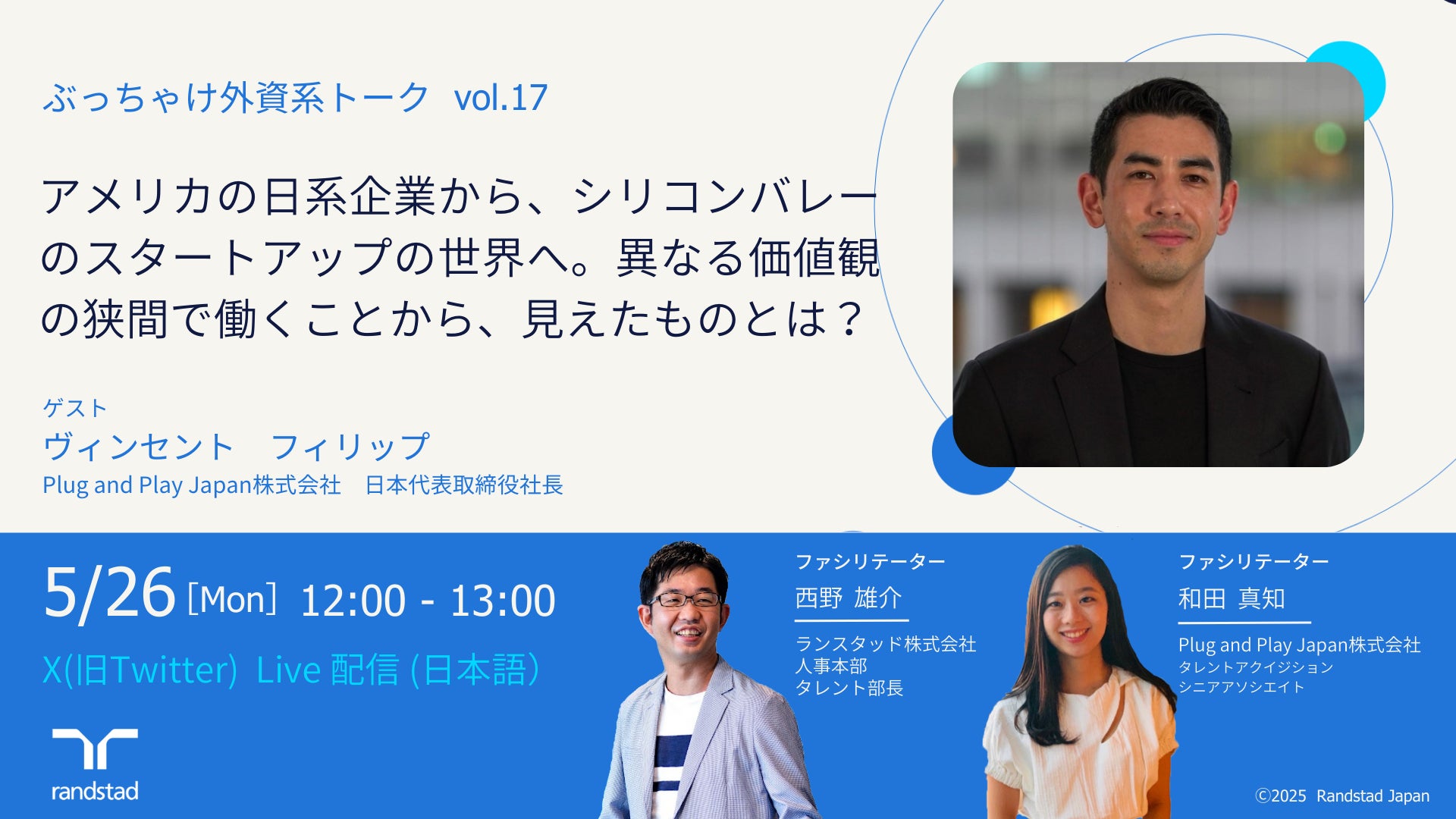 総合人材サービスを提供するランスタッド株式会社(本社:東京都千代田区 代表取締役社長 猿谷哲)は、5月26日(月)12時より、ソーシャルメディアX(旧Twitter)スペースにてライブ配信イベント「ぶっちゃけ外資系トーク」を開催することをお知らせいたします。ランスタッド株式会社 人事本部タレント部長 西野雄介がファシリテーターを務める本イベントは、外資系企業で活躍するゲストを迎え、その働き方やキャリアについて掘り下げる人気シリーズです。