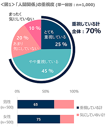 「人間関係をとても重視している」は25%、「とても+やや重視している」人は70%を占める。重視している割合は、男性は65%、女性75%であり女性の方が高い。<図1>
