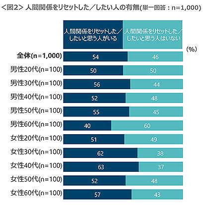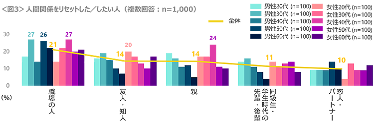 「人間関係をリセットした/したい人がいる」は、54%。特に女性30代、40代は高く、6割を超える。<図2> リセットしたい人間関係は、「職場の人」が21%と最も多く、次いで「友人・知人」と「親」の14%。性年代別にみると、男性30代、50代、女性40代において「職場の人」との人間関係リセットの経験や意向が強かった。「友人・知人」は女性20代、「親」は女性40代のリセット経験・意向が目立つ。<図3>